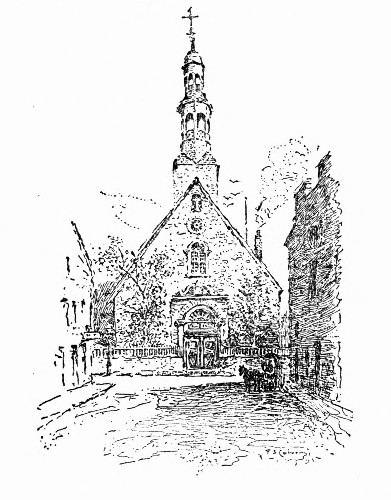 Near a modern window in the gallery leans an old spinning-wheel, which was found in the vaults. By its hum in winter twilights, a hundred years ago, soft lullabies were crooned, and fine linen spun for dainty brides, over whose forgotten graves the blossoms of a century of summers have fallen. In hoop and farthingale they tripped over the threshold of the old church of Notre Dame de Bonsecours. They plighted their troth as happily before the altar of the little chapel, as do their descendants in the stately church of Notre Dame, with the grand organ pealing through the dim arches and groined roof.