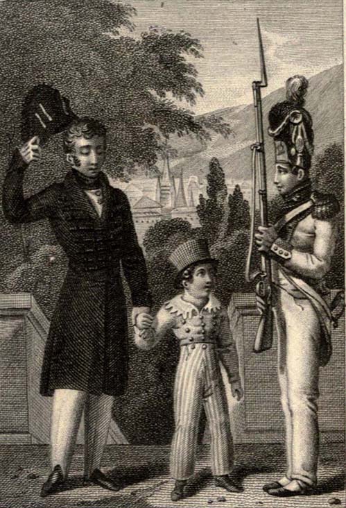 These deserved praises became, in some sort, bitter reproaches to Edward for his conduct, and a direct reproof for his want of respect towards the soldier who had presented arms to him. In vain did the officer of the guard seek to direct the attention of the young Prince from his situation; remorse and confusion only increased on the prisoner's countenance: he experienced, for the first time, that there are moments in life when we must yield to force, and that a single action is sufficient to dim the splendour of rank and birth. Oh! how many reflections crowded on the mind of the royal youth! These old[Pg 195] grenadiers, covered with honourable wounds, and overwhelming his father with such touching praises, made him feel that the same dignity of man often exists under epaulettes of wool, as under the grand cordon of the Prince! Edward had given himself up for the last hour to this precious self-examination, when one of his father's equerries entered the guard-house, and announced to the commanding officer, that his Royal Highness left his son to the discretion of the sentinel whom he had insulted. Edward, who imagined he had come to deliver him from his painful situation, blushed and cast down his eyes; but without suffering the slightest murmur to escape him. He advanced towards the young soldier, saying to him with[Pg 196] a penetrating voice, and in the most submissive tone: «Comrade, what do you require of me?» «Follow me instantly to your august father,» replied the latter, with warmth and emotion. He held out his hand to him, with respect, which Edward eagerly clasped in his, and both, followed by the equerry, repaired to the Prince's apartment. On entering, the soldier threw himself at the feet of his general, and begged forgiveness for a fault, which the young prince had so well expiated. «Rise, my brave fellow!» said Edward's father to him, «I expected no less from you.»