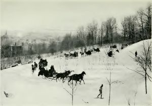 At the outskirts of one or two of the little towns we observed cabs, mounted, not on wheels, but on runners: they were, in fact, sleigh-cabs. Sleighs proper were frequent on the landscape. Very curious to our unaccustomed eyes it was to see a black dot moving afar off across a level expanse of snow—a level expanse, framed round with a border of forest-trees, showing that it was a lake. After a while, as we drew nearer to the point for which the black dot was also making, we became aware that it was a sleigh. We could just see the horse's legs going trot-trot-trot, and just discern two figures in the sleigh, muffled up to the nose in furs. And to think they were thus driving iron-shod over the deep waters!