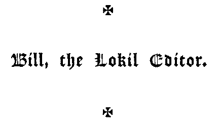 Bill wuz the best lokil the paper ever had. He didn't hustle around much, but he had a kind er pleasin' way uv dishin' things up. He cud be mighty comical when he sot out to be, but his best holt was serious pieces. Nobody could beat Bill writin' obituaries. When old Mose Holbrook wuz dyin' the minister sez to him: "Mr. Holbrook, you seem to be sorry that you're passin' away to a better land?"