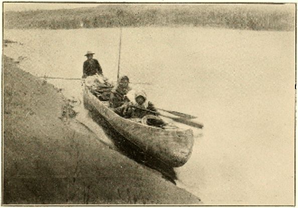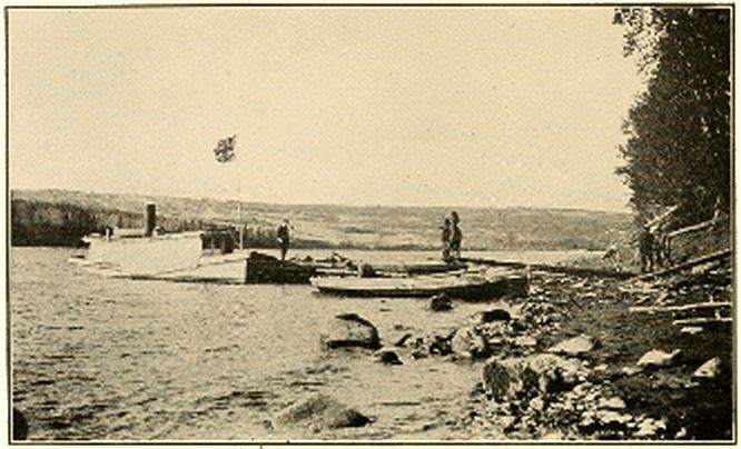 The settlement at the lower end of the lake is afflicted with the name of Saw Ridge, pronounced of course to rhyme with porridge. The change here was even more striking than at Grouard. Five years ago Tom Lilac's two little log shacks crouched alone among the sand dunes. Now there are three modern stores, a telegraph office, and a cable ferry. We had a sad sense that civilization was getting an inexorable grip on us, and we lingered no longer than was necessary to buy grub and to inquire about the steamboat. We learned that she had lain at Saw Ridge all night, and our friends were only an hour or two ahead of us on the river.