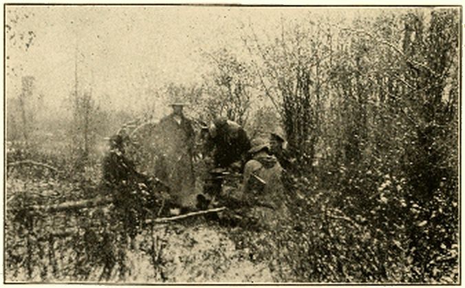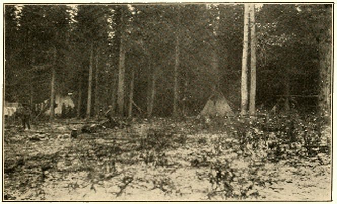 Since we did not seem to be making any progress to speak of, we decided to go ashore. It was too dark to pick a proper landing-place, and we were cast up on a steep declivity of oozy mud. There was no possible place to pitch the tent, so we sat ourselves down under a spruce tree that afforded a partial shelter and waited in the gloomy silence of perfect discomfort. There was nothing to say.