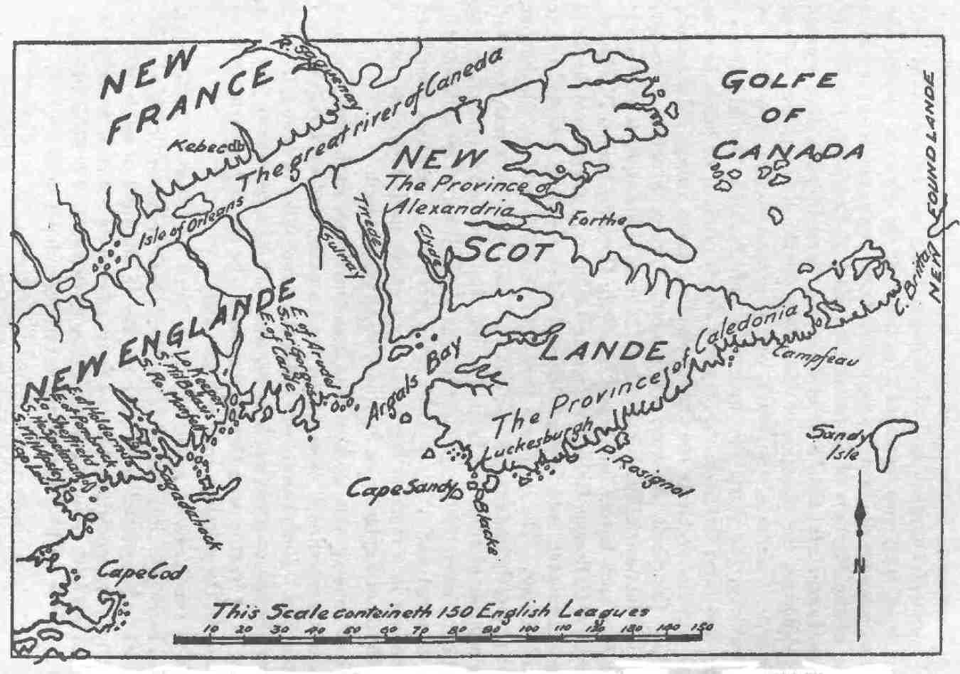 Alexander's confidential position at court enabled him to become[Pg 10] familiar with, and to form a favourable estimate of, these projects and consequently, when he was consulted by the King as to the removal of the French, who had been dispersed by Captain Argall from Port Royal—within New England territory—he saw the possibilities of the situation, and conceived the idea of founding a Scottish settlement in the new world. Already there were in existence New Spain, New France, New Holland, New England; why not a New Scotland? "Fertile in device and expert in execution, and of an unswerving tenacity of purpose," as he has been described by Charles Rogers, he lost no time to give his idea practical effect. In this resolve he was encouraged by Captain John Mason, Governor of Newfoundland, who had acquired a knowledge of the unsettled and conjested conditions in the islands and on the west coast of Scotland, when associated with Bishop Knox in suppressing lawlessness arising from clan feuds in these parts, and by Ferdinando Gorges, Governor of New Plymouth, who had had experience in colonization, and through whose influence later on the Charter rights of the New England Company over Acadia were surrendered to permit a re-grant of the lands to Alexander. To these circumstances Nova Scotia owes both its origin and its historical connection with Scotland, which has stood, and stands, for so much in the spiritual and material welfare of the Province. While Alexander's scheme was designed primarily to further his own fortune, it does not necessarily follow that he was devoid of patriotic motives, or that he was indifferent to the benefits which ought to acrue to his native land from a flourishing overseas colony. He purposed to provide an outlet for Scottish enterprise for the advantage and the credit of Scotland; hence, the name, "New Scotland." King James viewed Alexander's application with favour. The King had singular and consistent faith in colonizing as a means of increasing the national prosperity; and in so far as it might provide new industries and new opportunities for labour, he believed in its power as a civilizing agency. An interesting event in his Scottish reign, in this latter respect, was his attempt to restore and maintain law and order in the Hebridean Isles. In the year 1598 he granted the forfeited lands of the Lewis, Harris, Dunvegan and Glenelg to an Association of Lowland gentlemen (known popularly as the "Fife Adventurers"), for the purpose of reducing the turbulent clans to obedience to the laws, by furnishing to the people peaceful, industrial employment. The methods of carrying the project into effect rather than the demerit of the conception, may have caused its failure, but the failure of repeated efforts did not weaken James' confidence. The tenacity with which they held to opinions formed in youth by the precept of tutor or by the example of parent was a striking characteristic of the last four Stuart kings. They counted no price too[Pg 11] high, no violation of good faith too base if such would promote and establish the principles they conscientiously entertained and in which they believed, whether pertaining to Church or State. In this, indeed, they were conspicuously true to the Scottish type, whether of the persecuted or the persecuting class; alternately coercing or resisting, as the case for the moment might be.