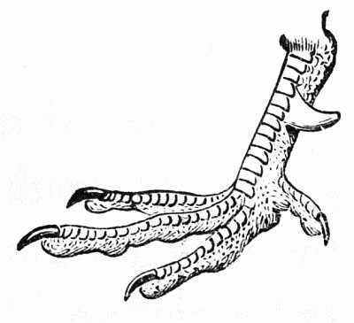 4. And what about hen's teeth? The hen, and all other scratchers, have teeth, but not in the mouth. Their food is swallowed without chewing, and is at once stored in the crop, where, it remains until it is softened. Then it passes into the gizzard, where it is rubbed and ground between tough, hard ribs, like the grooves of a wash-board. To help in this work, the gizzard is filled with sharp stones and bits or gravel which she has swallowed. These are the hen's teeth, and they work quietly, both while she is gathering food and when she is resting or roosting.