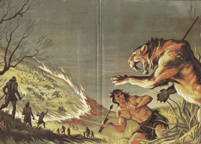 For a moment the watching hunters were silent. Then the wind veered sharply from Hawk to the fire, and at once the hunters began their insane leaping and their weird, animal screaming. Following their noses, they rushed toward the place where they knew their enemy, and not a saber-tooth, waited.