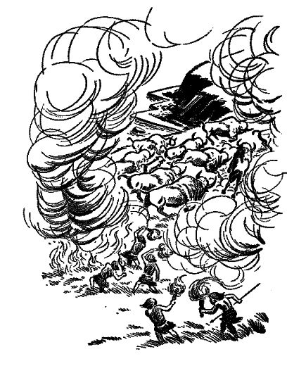 A great, rumbling bellow came from the besieged herd. Cows with calves at their heels trotted nervously toward the river. Massive bulls stayed in the rear, shaggy heads lowered toward the approaching flames, alert to meet any danger. Watching, Hawk scarcely breathed.