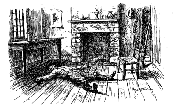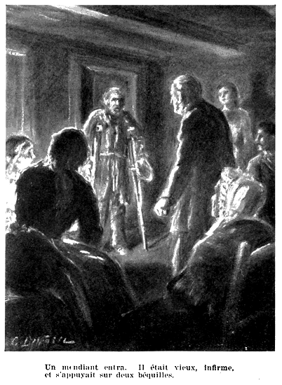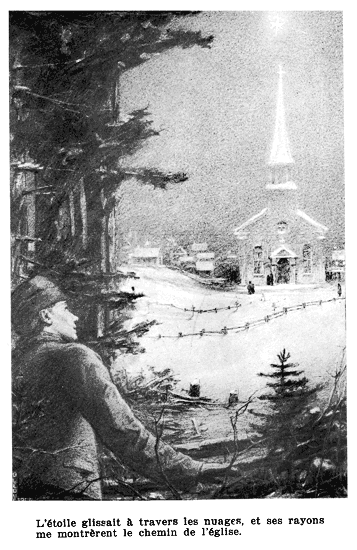 Quand nous arrivâmes, le prêtre était en prière. Des voisins, hommes et femmes, garçons et filles, agenouillés sur le plancher nu, suivaient ses mouvements avec curiosité. Nous fîmes comme les autres. Nous avions, par respect pour le bon Dieu, laissé le fusil et le hibou sur le perron de pierre, tout près de la porte. Sur une petite table recouverte d'un drap blanc, on avait placé un crucifix de plâtre et deux pâles bougies. Le crucifix portait de larges taches rouges sur le front, sur le côté, sur les mains et les pieds, et les bougies répandaient dans la pièce basse une lueur mélancolique.