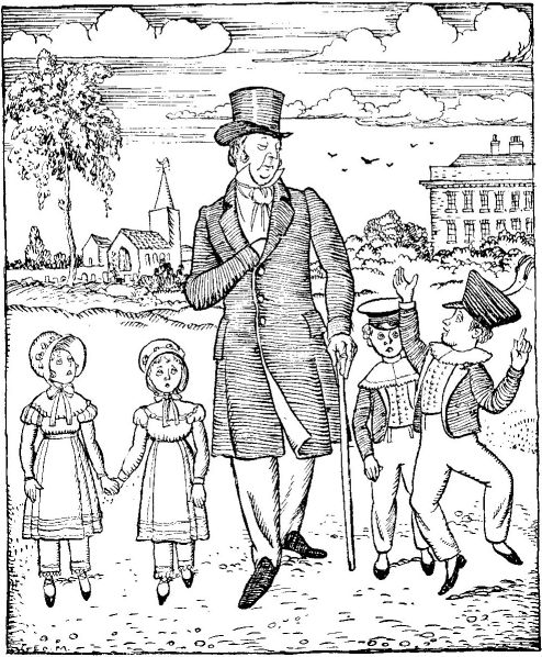 It did not take the little girls long to array themselves in their bonnets and tippets, nor their brothers to prepare themselves in a suitable manner for the excursion. When they were assembled in the hall Mr. Birdikin made his appearance from the library. John, the footman, who was in attendance, handed him his hat, gloves, and walking-cane, and the condescending word of thanks with which he was rewarded sent him back to the domestic quarters of the house in a thankful spirit at having taken service with so excellent a master, who seldom raised his hand in anger against a menial and had never been known to enforce his instructions by an oath. Small wonder then that Mr. Birdikin received willing service from those in his employ, who were assured of a comfortable home and such moral instruction as was suited to those of an inferior order, unless some serious delinquency should bring about their dismissal or illness render them no longer capable of performing the duties of their station.