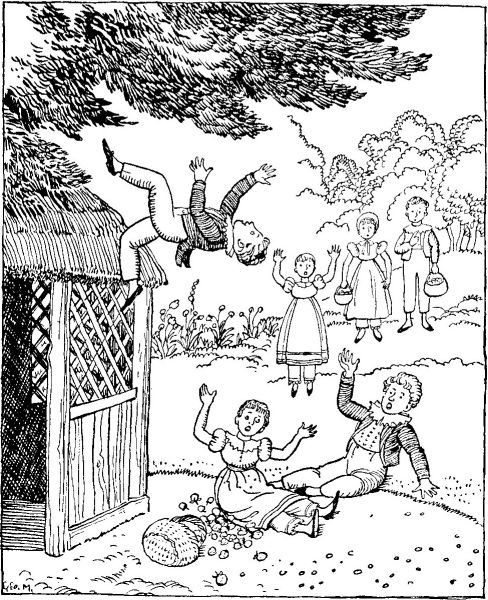They then returned to the summer-house, now supposed to be the homely cot of a tiller of the soil. There they were met by Clara, who had in vain tried to persuade Thomas and Fanny to descend from their hiding-place. She at once disclosed their situation, to the intense annoyance of Fanny, whose ruse was thus discovered. 'Tell-tale!' she cried, and before the word was well out of her lips she had slipped from the precarious slope of the roof and fallen upon Henry, whom she bore to the ground, upsetting the basket he was carrying and ruining her freshly-washed and ironed cotton frock with the juicy fruit, upon which she subsided in a sitting posture.