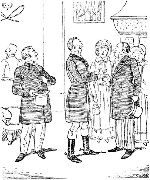 Arrived at the entrance to the Earl's mansion, Mr. and Mrs. Birdikin alighted, and, followed by the children, entered the stately precincts, there to be regaled with such refreshment as was fitting for the occasion. Mr. Birdikin was gratified to observe the children instantly seized upon by the Viscount Firebolt, the Honourable John, and the Lady Mary, for he felt that this exhibition of intimacy between his own offspring and that of his host could not but impress those of his neighbours who were witnesses of it. The Earl himself, a handsome and manly figure in his scarlet coat, came forward to greet him, and requested him, in humorous fashion, to take something to keep out the draught. Mr. Birdikin was about to engage him in a serious conversation about the Corn Laws, which were then exercising the minds of landowners, but he turned aside to greet others of his guests, and what was Mr. Birdikin's surprise to see that these were none other than Mr. Clott, the ironmonger, Mrs. Clott, and her niece, Miss Smith.