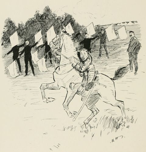 Wednesday.—Something about living in the open that has a very stimulating effect upon one. Made quite an excellent breakfast. The Adjutant gave a most interesting lecture on outpost work before we started; he mentioned several points that I don't mind confessing had slipped my memory. I feel sure, with a little careful instruction, the efficiency of the Volunteer Force would be enormously increased. Must refer to it in the House on earliest opportunity. Did an attack with the Brigade this afternoon; very disappointing. Up to certain stage everything went well, but, as attack developed, got in some way mixed up with the Blankshires, who were, undoubtedly, far out of their proper line. Had slight argument with their C.O. Dear old chap, of course, but absolutely pig-headed. Would not see my point. G.O.C.'s remarks rather uncalled for, under the circumstances. Had to speak to several of the company officers about letting their men get out of hand. The various Adjutants seem to regard the matter with an amount of levity which I don't altogether approve of. Mess very uproarious to-night; most unnecessarily so in my opinion. Heard afterwards one of the subalterns had given a lecture on "Tactics, as he understood them."