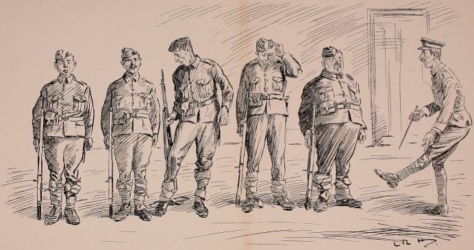 Paraded in the afternoon for the reg'lar inspection; was kept out in the burnin' sun standing still for about two hours while another General walked round an' looked at our buttons an' boots, an' found fault with every blessed thing. They seems to think yer kit is made to look at, not to use. As I ses to Ted in the canteen after, "We comes to camp for trainin', an' this 'ere's nothing but wastin' time, as could be done at 'ome anywhere."