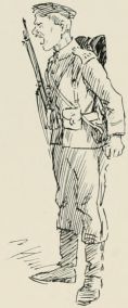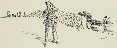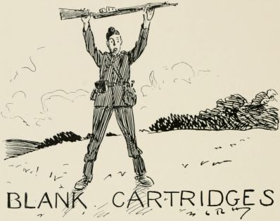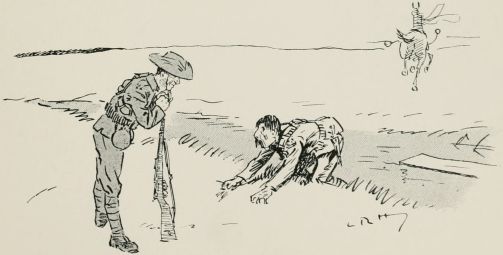 After breakfast we was out again doin' outposts. Wish they wouldn't 'ave so much make believe about it. Supposin' now they puts yer in a group as sentries. "The henemy," they ses, "is somewhere over there, an' you've to watch that bit o' country in front of you; the countersign's 'Bunkum,' an' you've to keep under cover." Well, there aint no henemy, an' nothin' aint goin' to 'appen, an' yer wouldn't know wot to do if it did, so you just lies down an' smokes till the "assembly" goes, an' then you comes back. It may teach officers something, but it don't teach us much.