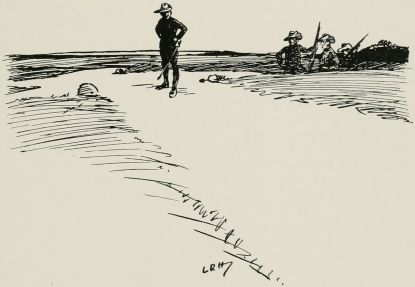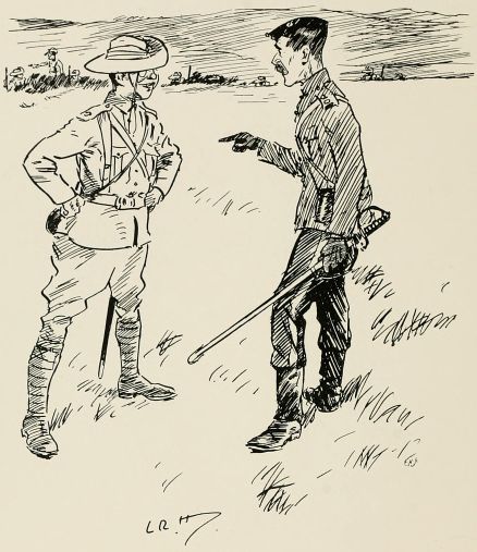 Find we're to act as rearguard to something. Got told off to occupy a bit of a wood right away on the flank. Thank goodness they haven't told me what to do or how long to hold on, or anything, so I shall get out of touch as soon as I can and play off my own bat. Rather good little wood. Men awfully keen on the job. Soon after we occupied position, spotted party of the enemy coming through gap in the hills. Couldn't see them very well on account of the haze, so waited till they got fairly near, and then gave 'em a volley. They sent an orderly over to know what the deuce I meant by firing on the ambulance. Felt rather an ass, but found out afterwards every party they had passed had paid them the same compliment. Soon after scout came in with news of enemy. I wanted to ambush 'em, but some silly fool fired without orders, so it became a regular attack. Put three companies out of action before we retired, but cut it rather too fine, and a few of my chaps got collared. Found the rest of the rearguard had cleared before. Some of 'em mistook us for the bally foe, and blazed into us like old boots. Rotted 'em no end when we got up to them. Everything got in the most awful muddle after a bit; no one knew who was which. After the "Cease fire" sounded came across a lot of chaps firing like mad at anybody who came near. Told 'em the "Cease fire" had gone. "'Cease fire' be damned!" said one of them. "We ain't had a look in till now!"