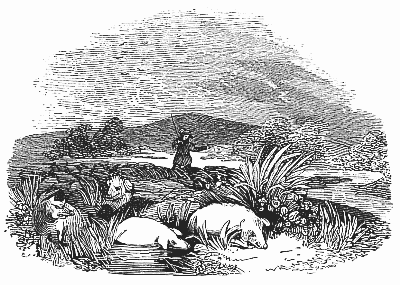 Bladud at first felt the change of his fortunes very keenly, for he had been delicately fed and nurtured, and surrounded by friends, servants,[Pg 21] and busy flatterers. He was now far separated from all who knew and loved him; exposed to wind and weather, heat and cold, and compelled to endure every species of hardship. He had no other bed than straw or rushes; his food was far worse than that which is now eaten by the poorest peasants, who deem their lot so hard; and he was clothed in undressed sheep-skins, from which the wool had been shorn. His drink was only water from the brook, and his whole time was occupied in his attendance on the swine.
