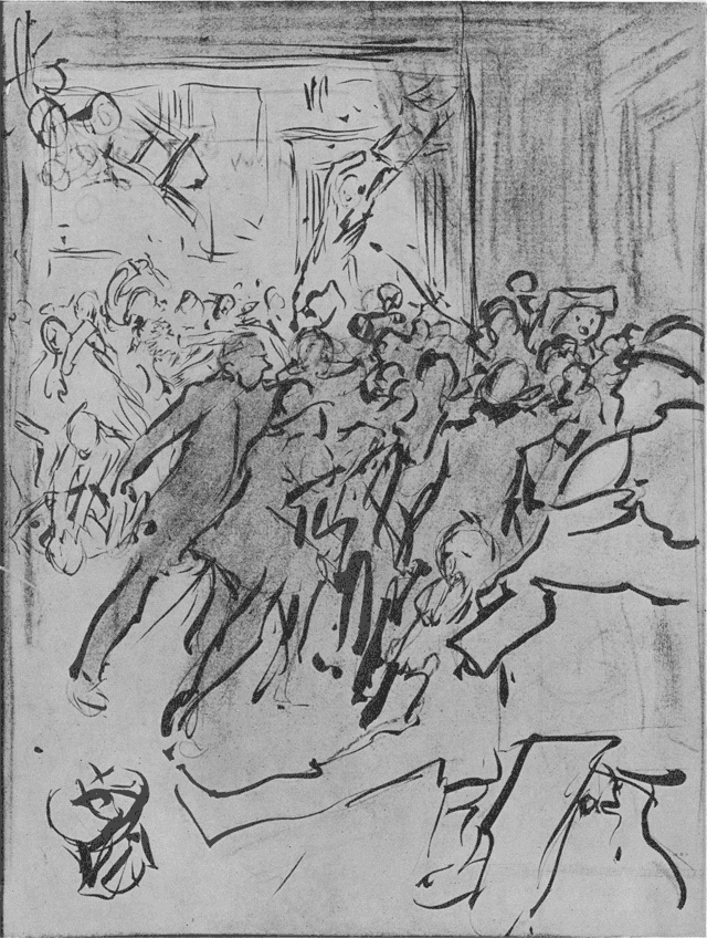 The sad ravages of disease can be estimated from the fact that at his death his weight had been reduced to only five stone. May never ceased to draw as long at his fingers could guide the pencil. A number of sketches, executed on his deathbed, of a model who sat daily in seventeenth-century costume--the absolute last--betray no sign of weakness or failing power. It is remarkable that six of the greatest of English draughtsmen--Randolph Caldecott, A. Boyd Houghton, George J. Pinwell, Frederick Walker, Tom Browne and Phil May--all died before reaching the age of forty. So passed a lovable man and a great artist, ‘a fellow of infinite jest, of most excellent fancy’.