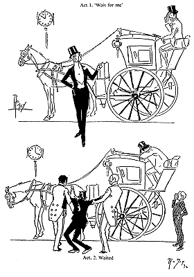 ![]() MALAPROPOS Mrs Snobson (who is doing a little slumming for the first time and wishes to appear affable, but is at a loss to know how to commence conversation): ‘Town very empty!’ Larger size |