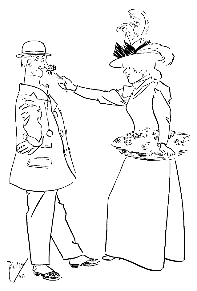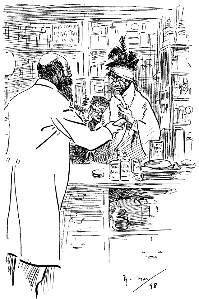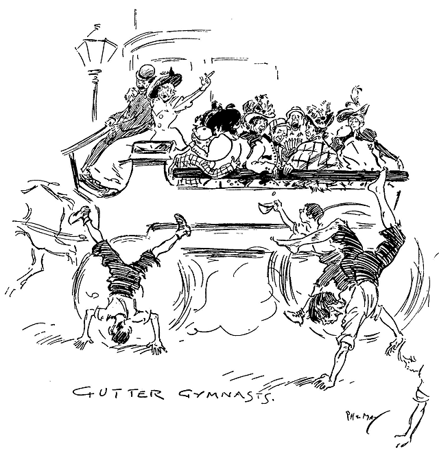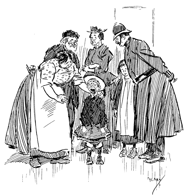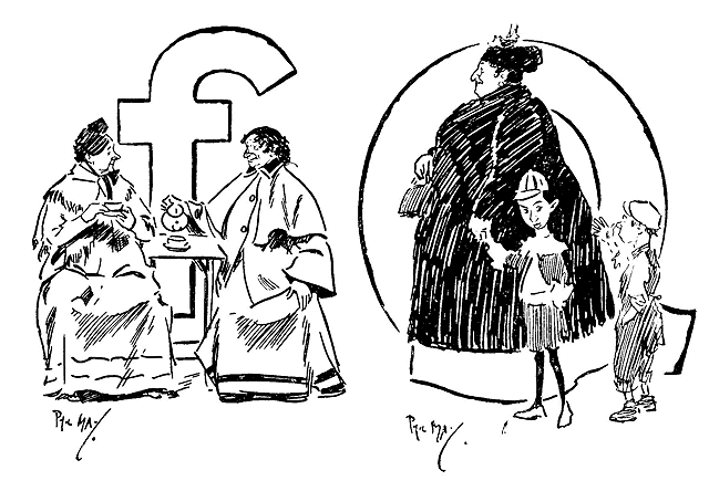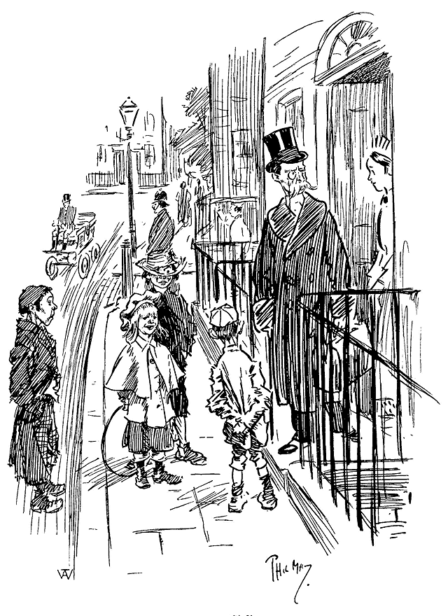 Phil May made his first appearance in Punch with a small drawing on October 14th, 1893. Ten of his drawings were published in its pages in 1894, and thereafter he rarely missed a weekly contribution and was well represented in the Almanacks. At first his humour, dealing as it often did with low life, was considered somewhat out of place in its sedate surroundings, and it was not until February, 1895, that his powers, admirably championed by Mr M. H. Spielmann, were fully recognized, and he was elected to the Punch staff, where he remained a much-valued and very popular member until his death. His initials are carved on the famous table between those of Thackeray and Du Maurier. At his first Punch dinner he was obviously shy and nervous and a little bored. At the end of the evening when nearly everyone had gone, he turned quietly and timidly to Bernard Partridge with his customary suggestion, ‘Let's go to Romano's and have a drink.’ When other engagements prevented him attending the dinner he generally managed to secure a copy of the menu as ‘evidence for Lil’.
