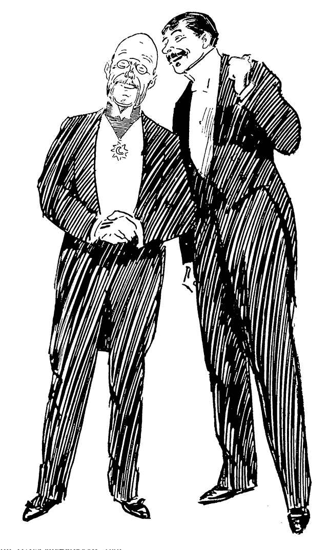 With this the last of his bad times passed and the broken dawn began to open into real daylight. Again it was the kindly Lionel Brough who befriended him. Nell Gwynne was to be put on at the Avenue Theatre with three great favourites in the cast--Florence St John, Arthur Roberts, and Lionel Brough. Charles Alias was to provide the costumes, and Lionel Brough's suggestion that Phil May should design them was accepted. Alias was another of the good friends of the struggling youngster, who showed his grateful affection by the many excellent portraits of the French costumier which he introduced into later drawings. The small, dapper figure, the kindly, amused face with black hair brushed straight back, and the darkly tinted pince-nez will be found in many of May's theatrical illustrations.