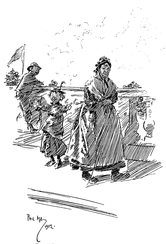 In 1893 Mr W. L. Thomas formed the excellent plan of sending May on a tour round the world in company with E. S. Grew, a member of The Daily Graphic literary staff. The resultant text and drawings, which began to appear on April 16th, provided a notable feature of that journal for the duration of the tour. The World's Fair at Chicago became the limit of the journey, for here May rebelled. Industrious and persistent as he was in his work, in other matters a certain whimsical irresponsibility was part of his nature, and no doubt Grew, who was inspired to style himself ‘Phil's chaperon’, had not found it altogether easy to keep his erratic companion to the appointed track even so far. Probably the American types did not appeal to him like his beloved Londoners, or perhaps the home-sickness which had brought him back from Australia again asserted its influence. May insisted that America did not agree with him, and it was plain that he was not disposed to go on. It was a long way to London travelling west from Chicago, and much shorter to go back in an easterly direction. So it came about that on July 6th, 1893, the two returned travellers might have been seen mounting the stairs of The Daily Graphic office to face the disappointed proprietor. Work was resumed in London, and May's drawings in The Graphic publications were none the fewer, though less world-wide in subject than they might have been. A selection from them, including several of those done in America, was published in book form in 1897.