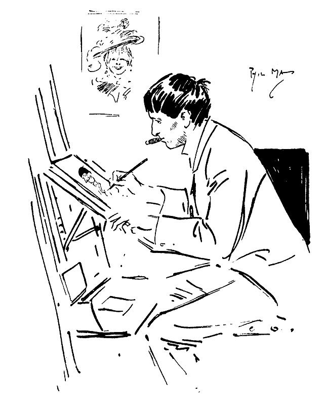 In such circumstances it will be understood that May's life was in a double sense a hand-to-mouth existence. Mr Ernest Brown, proprietor of the Leicester Galleries and a good friend of May, had quite a collection of letters, some charmingly illustrated, all appealing for money on account. Many of the letters referred to periods of ill-health, and, as may be supposed, much of his work was done under very adverse conditions. Nobody, however, could have been more scrupulously conscientious in ultimately fulfilling his obligations whether he had spent the money or not. Often he had to escape to the country or to France to complete a batch of commissions. Unfortunately he was not so particular in the important matter of punctuality, and most of the editors for whom he worked were obliged to send a representative to fetch his drawings. Sometimes the call had to be repeated several times and often the work was done while the messenger waited. Despite all these drawbacks, mostly self-inflicted, the amount of sheer hard work he got through was surprising. Others besides Mr Ernest Brown, editors especially, must have received similar letters, and the cheques they elicited, although often large, usually melted in a few hours. It was a standing order at The Sketch office that five pounds were always to be left out to be paid to May in exchange for any drawing he might leave. The result of this arrangement was that the artist, finding himself in need of money when in the Strand neighbourhood, would draw a sketch (usually just a single figure--a type of character or the like) just as another person might draw a cheque, and cash it over the counter. This proved to be a profitable investment, for after May's death, when all the rest of his work had been published, The Sketch still had a long series of Phil May drawings in hand. Mr Harvey Thomas has described how Phil, finding nobody in The Sketch office but an inexorable clerk or office boy, who would part with nothing till he could grasp the drawing, would calmly stroll into The Graphic office, borrow a sheet of Bristol board and a pen, make a quick sketch, and take it straightway into the ‘opposition shop’ to draw his fiver! He had a similar convenient arrangement with Mr T. J. Barratt, the managing director of A. and F. Pears Ltd, who used many of his drawings as effective and unconventional advertisements.