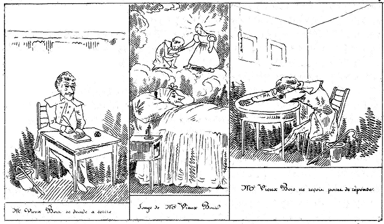 | Mr. Vieux-Bois se décide à écrire. | Songe de Mr. Vieux-Bois. | Mr. Vieux-Bois ne reçoit point de réponse. |