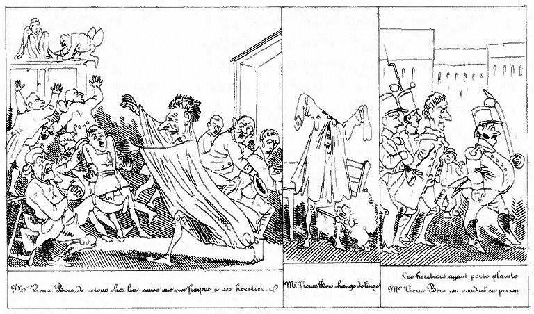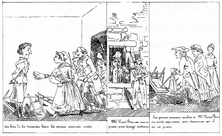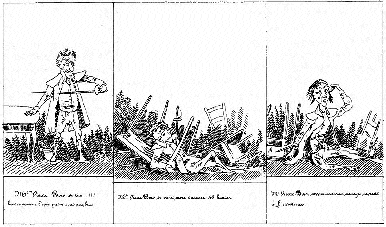 | Au bout de la troisième heure, les voisins accourent irrités. | Mr. Vieux-Bois est mis en prison pour tapage nocturne. | Les parents venant rendre à Mr. Vieux-Bois sa visite apprennent avec étonnement qu'il est en prison. |