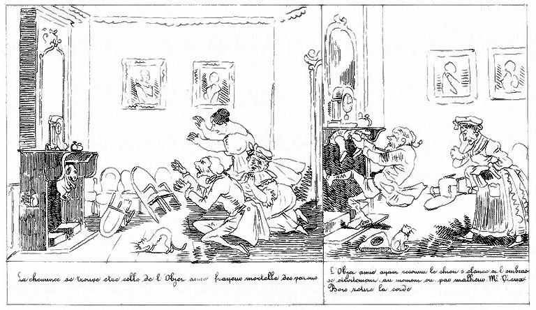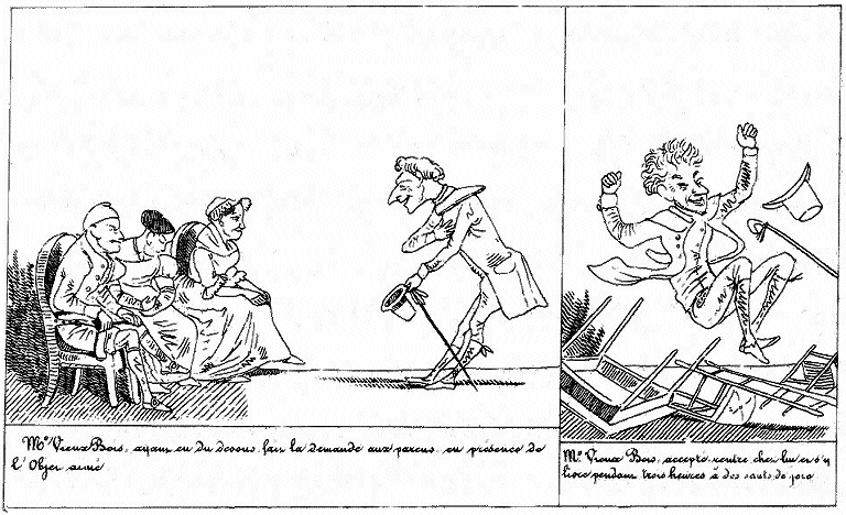 | Mr. Vieux-Bois, ayant eu du dessus, fait la demande aux parents, en présence de l'objet aimé. | Mr. Vieux Bois, accepté, rentre chez lui et s'y livre pendant trois heures à des sauts de joie. |