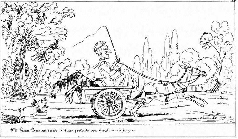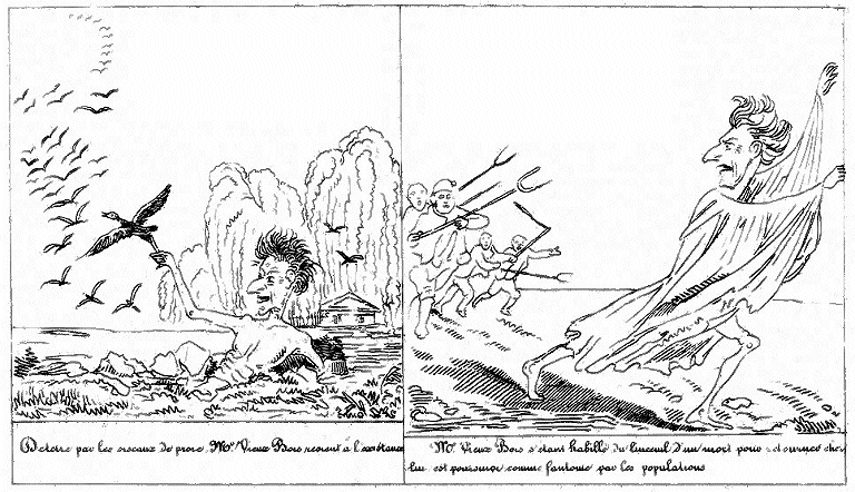 | Aux premières froidures Mr. Vieux-Bois, sous le nom provisoire de Tircis, quitte les hauteurs et vient chercher dans les plaines embaumées de plus tièdes zéphirs. | Cependant les eaux ayant considérablement baissé, la chaise laissée à sec échoue non loin du couvent. | Par la même cause la grande roue cesse de tourner et le rival prend terre. | Et puis se sèche au soleil. |
