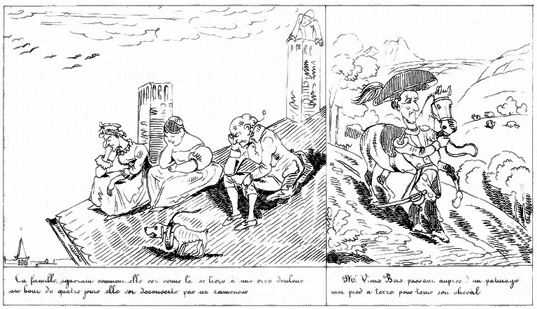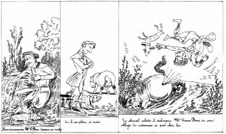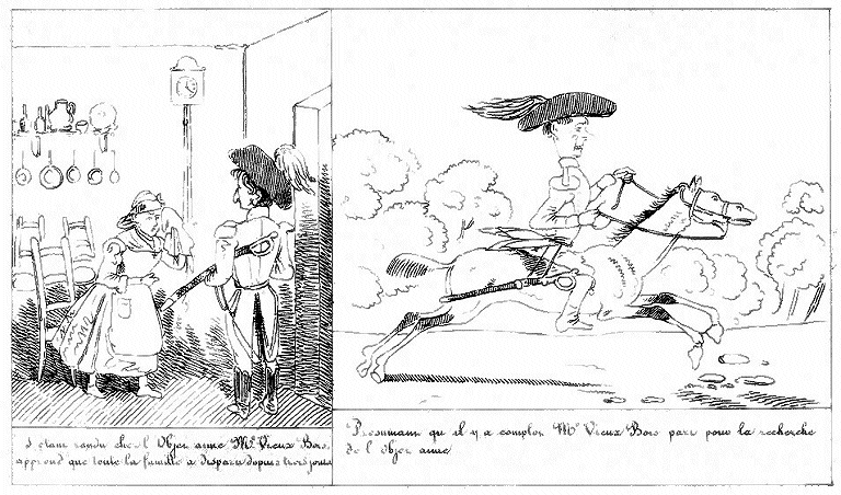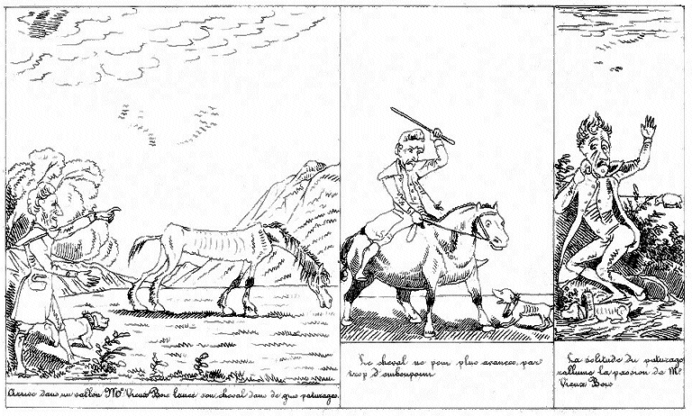 | Arrivé dans un vallon Mr. Vieux-Bois lance son cheval dans de gras pâturages. | Le cheval ne peut plus avancer, par trop d'embonpoint. | La solitude du pâturage rallume la passion de Mr. Vieux-Bois. |