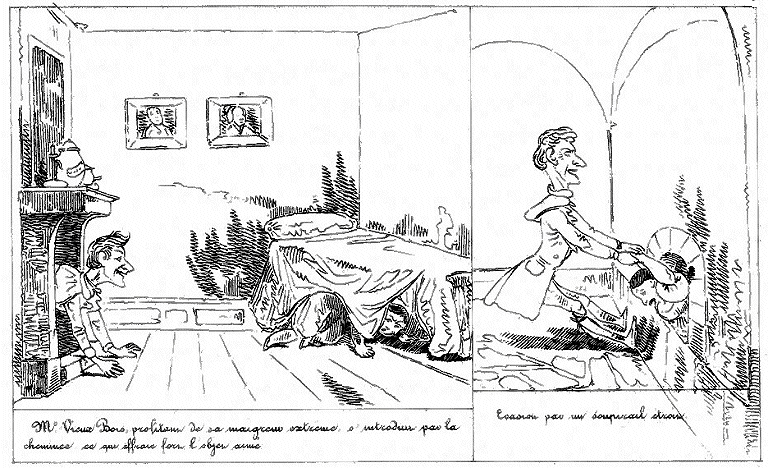 | Tout à coup, Mr. Vieux-Bois a l'ivresse d'apercevoir l'objet aimé à une croisée, de l'autre côté de la rue. | S'étant livré à un saut de joie bien excusable, Mr. Vieux-Bois enfonce la toiture et disparaît. |