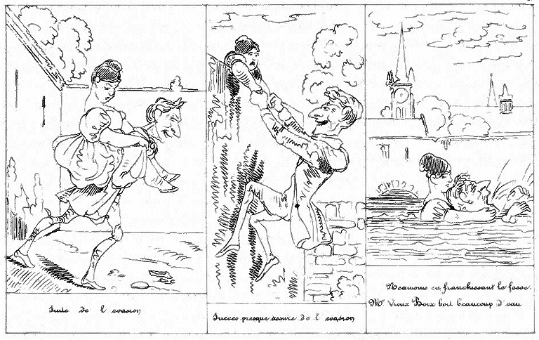 | Suite de l'évasion. | Succès presque assuré de l'évasion. | Néanmoins en franchissant le fossé, Mr. Vieux-Bois boit beaucoup d'eau. |