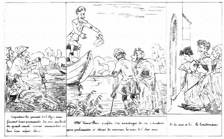 | Cepedant les parents de l'objet aimé faisant leur promenade du soir au bord du grand canal, croient reconnaître au loin leur enfant chéri. | Mr. Vieux-Bois profite des avantages de sa situation pour parlementer et obtient de nouveau la main de l'objet aimé. | Et la noce a lieu le lendemain. |