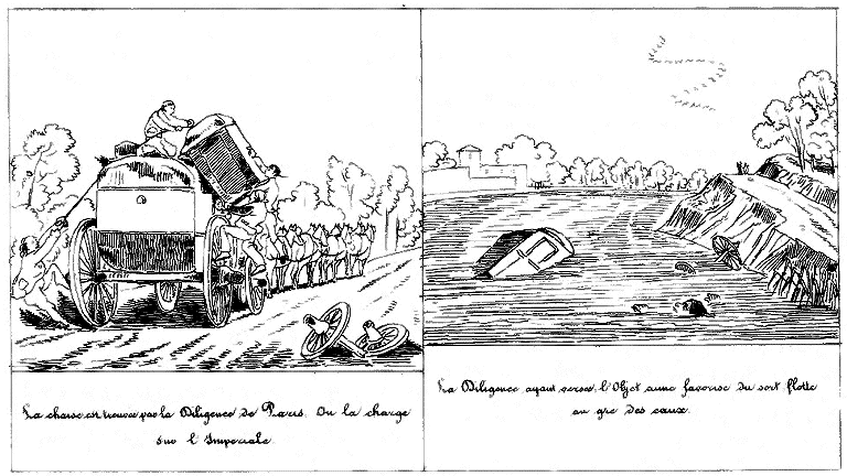 | La chaise est trouvée par la diligence de Paris. On la charge sur l'Impériale. | La diligence ayant versée, l'objet aimé favorisé du sort, flotte au gré des eaux. |