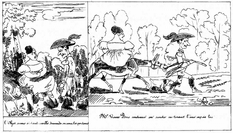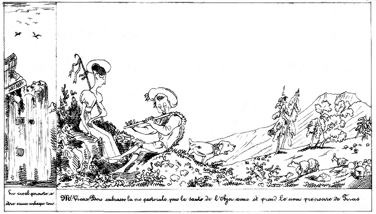 | La vie pastorale ayant singulièrement engraissé l'objet aimé, Mr. Vieux-Bois commence à concevoir de l'inquiétude. | Mr. Vieux-Bois ayant disposé un palanquin bucolique confie à deux pâtres le soin de le porter et reprend le chemin de sa patrie. |