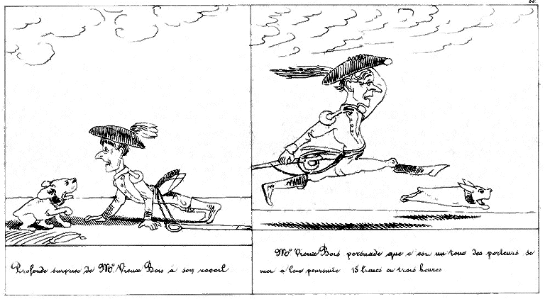 | Mr. Vieux-Bois s'étant un peu remis, reprend sa grande course. Quinze lieues en trois heures. | Ayant repassé près des moines qui l'instruisent de ce qui s'est passé et lui donnent des indications. Mr. Vieux-Bois les délivre en reconnaissance de ce service et reprend sa grande course. Vingt lieues en deux heures. |