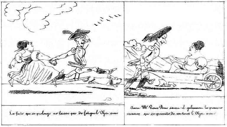 | La fuite qui se prolonge ne laisse pas de fatiguer l'objet aimé. | Aussi Mr. Vieux-Bois saisit-il galamment la première occasion qui se présente de voiturer l'objet aimé. |