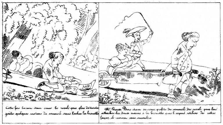| Cette fois, la nuit étant venue, le rival pour plus de sûreté, goûte quelques instants de sommeil sans lâcher la brouette. | Mr. Vieux-Bois étant survenu profite du sommeil du rival pour lui attacher les deux mains à la brouette puis l'ayant utilisé de cette façon, il revient sans encombre. |