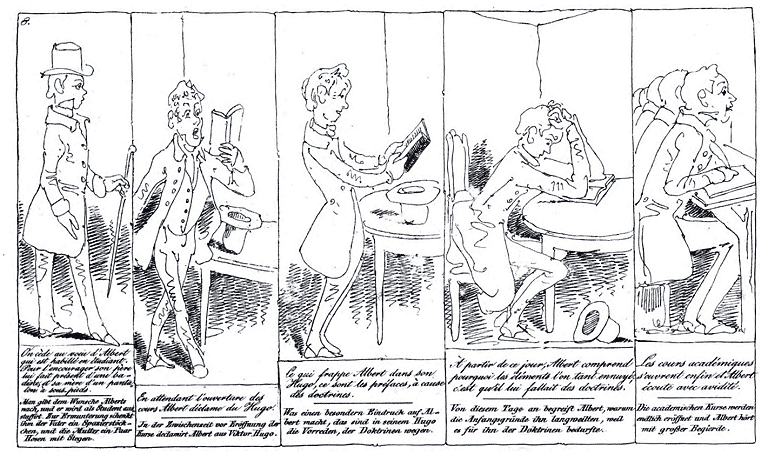 | On cède au voeu d'Albert qui est habillé en étudiant. Pour l'encourager son père lui fait présent d'une badine, et sa mère d'un pantalon à sous-pieds. | En attendant l'ouverture des cours Albert déclame du Hugo. | Ce qui frappe Albert dans son Hugo, ce sont le préfaces, à cause des doctrines. | A partir ce jour, Albert comprend pourquoi les éléments l'ont tant ennuyé; c'est qu'il lui fallait des doctrines! | Les cours académiques s'ouvrent enfin et Albert écoute avec avidité. |