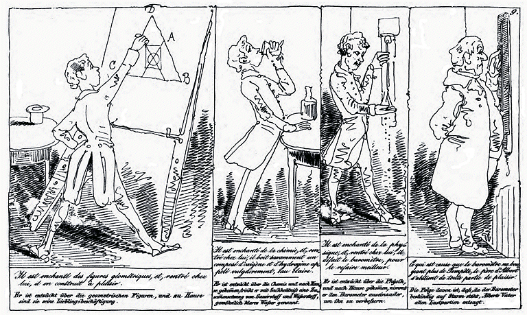 | Il est enchanté des figures géométriques, et, rentré chez lui, il en construit à plaisir. | Il est enchanté de la chimie, et, rentré chez lui, il boit savamment un composé d'oxygène et d'hydrogène appelé vulgairement, eau claire. | Il est enchanté de la physique, et, rentré chez lui, il défait le baromètre, pour le refaire meilleur. | Ce qui est cause que le baromètre ne bougeant plus de Tempête, le père d'Albert s'abstient de toute partie de plaisir. |