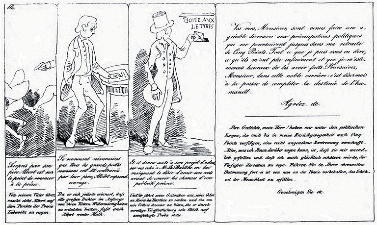 | Surpris par son père, Albert est sur le point de renoncer à la poésie. | Se souvenant néanmoins que tous les grands poètes naissants ont été contrariés par leur père, Albert reprend courage. | Et il donne suite à son projet d'adresser ses odes à Mr. La Bartine en lui marquant le désir d'avoir son avis avant de courir les chances d'une publicité précoce. |