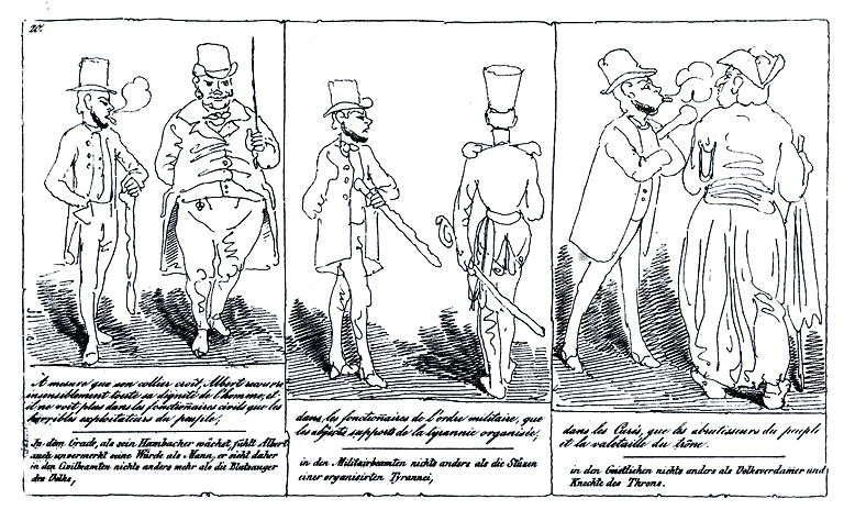 | Ayant appris qu'Albert est établi à Bordeaux, Mangini, Pacini et Carabini viennent l'y voir, et ils se plaisent à boire à sa santé. | Et aussi à la santé de la liberté! | de l'Égalité!!!! de la fraternité!!!! de la vérité!!!! de la haine des tyrans!!!! des fonctionnaires!!!! du clergé!!!! de la presse soudoyée!!!! de l'autocratie!!!! de Rothchild!!!! de Metternich!!!! Metternich!!!! de..... etc., de..... etc., de..... etc., de..... etc. |