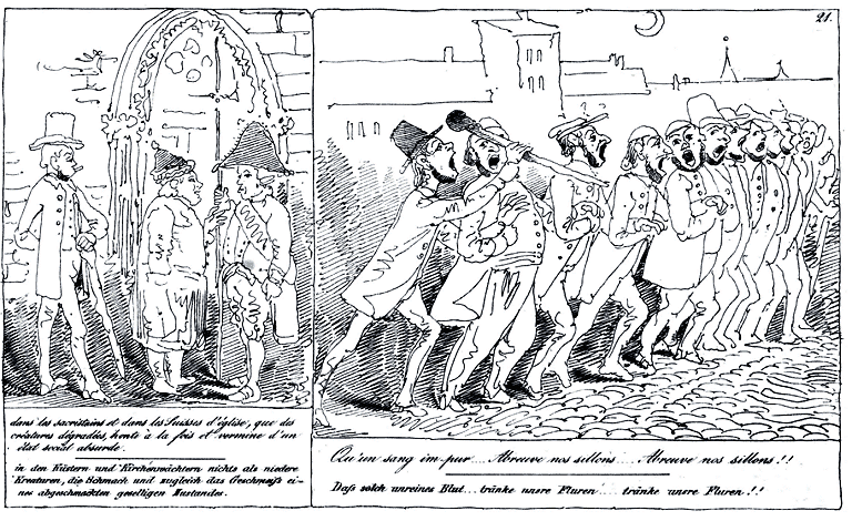 | Arrivés sur le sol Helvétique, les quatre amis saluent avec ivresse cette terre de liberté. | Et entrés dans le chef-lieu, ils fraternisent avec les publicistes de l'endroit. |