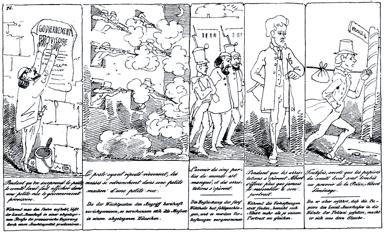 | Pendant qu'on surprend le poste, le comité local fait afficher dans une petite rue le gouvernement provisoire. | Le poste ayant riposté vivement, les masses se retranchent dans une petite maison d'une petite rue. | L'avenir des cinq parties du monde est manqué, et des arrestations s'opèrent. | Pendant que les arrestations s'opèrent, Albert s'efforce plus que jamais de ressembler à son portrait. | Toutefois, averti que les papiers du comité local sont tombés au pouvoir de la police, Albert déménage. |