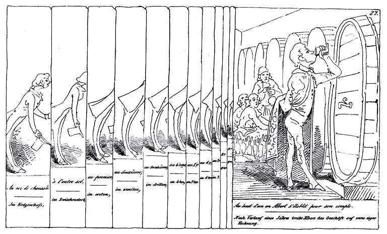 | Par malheur, la faillite est déclarée; et Jaques déménage. | Entré chez un Editeur libraire, Albert est chargé du placement de la grande édition de la Métaphysique pittoresque, texte et gravures, en sorte qu'il recommence à assassiner d'étage en étage. | Au rez-de-chaussée, au premier, au 2ème, au 3ème, au 4ème. |