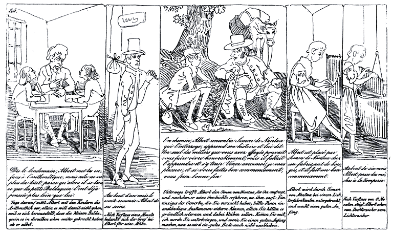 | Entré chez un épicier, Albert y trouve toute l'édition de ses harmonies orageuses mise en cornets. | Et tant de poésie inspirant le dégoût du poivre et de la cannelle, il méprise son état et forme des rêves de gloire. | Ayant traité son patron d'homme vulgaire, Albert est dans le cas de déménager. | En route, Albert achète pour trois francs cinquante centimes, le secret de la méthode d'Aubuisson par laquelle on enseigne l'histoire universelle en quatre leçons. |