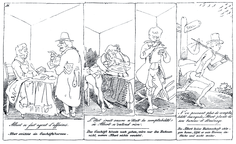 | Par malheur le chocolat se trouve avoir le goût de Guano, et la consistance de la craie de Briançon. | La faillite est déclarée et Albert déménage. | Dégoûté du commerce, Albert entre comme instituteur chez le Comte Baldaquin. | Mais le Comte lui explique qu'il veut pour ses enfants point du tout de physique de droit naturel ni de doctrine, et, au contraire, beaucoup d'orthographe et d'arithmétique. |