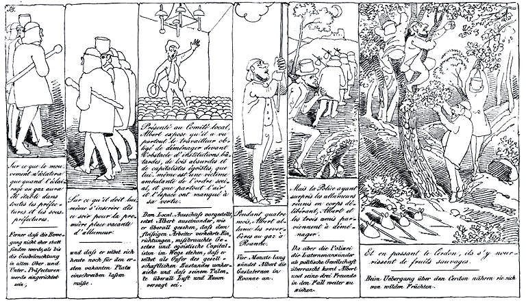 | Le 50e Nº attaque les pouvoirs, persifle les fonctionnaire, et raille les sous-officiers. Tous le caporaux s'abonnent. | Le 50e Nº vaut à Albert des témoignages qui lui rappellent bien vivement la maison paternelle. | Néanmoins Albert trouve l'état bon; et la Suisse un vrai pays de ribote pour les publicistes, en sorte qu'il ne déjeune plus que d'huîtres et de côtelettes payées comptant. | Le 60e Nº attaque avec violence les puissances étrangères. Tous les réfugiés s'abonnent. | Le 70e Nº déplore la mauvaise organisation du travail, et il s'apitoie sur le sort d'un peuple vertueux, qui est livré sans garantie à l'exploitation d'une minorité de capitalistes avides. |