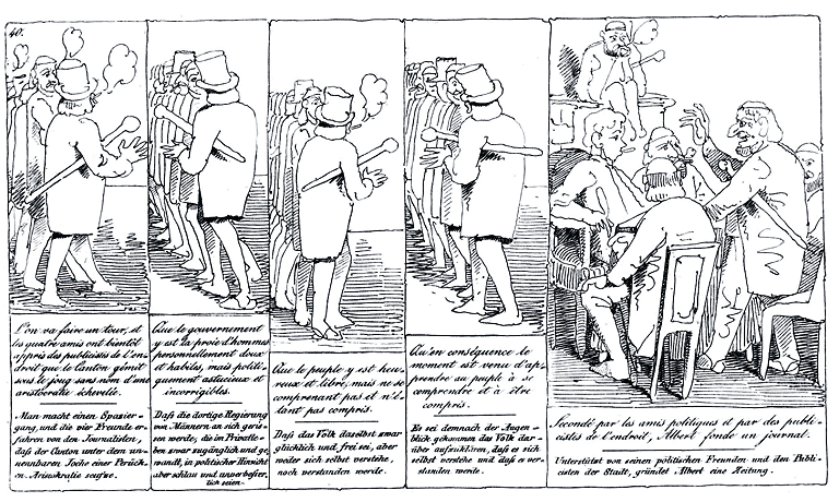 | L'on va faire un tour, et les quatres amis ont bientôt appris des publicistes de l'endroit que le Canton gémit sous le joug sans nom d'une aristocratie échevelée. | Que le gouvernement y est la proie d'hommes personnellement doux et habiles, mais politiquement astucieux et incorrigibles. | Que le peuple y est heureux et libre, mais ne se comprenant pas et n'étant pas compris. | Qu'en conséquence le moment est venu d'apprendre au peuple à se comprendre et à être compris. | Secondé par les amis politiques et par les publicistes de l'endroit, Albert fonde un journal. |