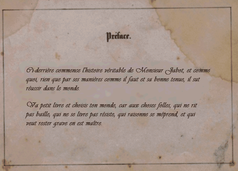 ...de la Franchipane ...de Mirliflor!! Deux de!!! Mr. Jabot s'enflamme. | Et si j'étais un jour M. le Marquis du Jabot, de la Franchipane de Mirliflor!!!!!!! Il se met à écrire. |